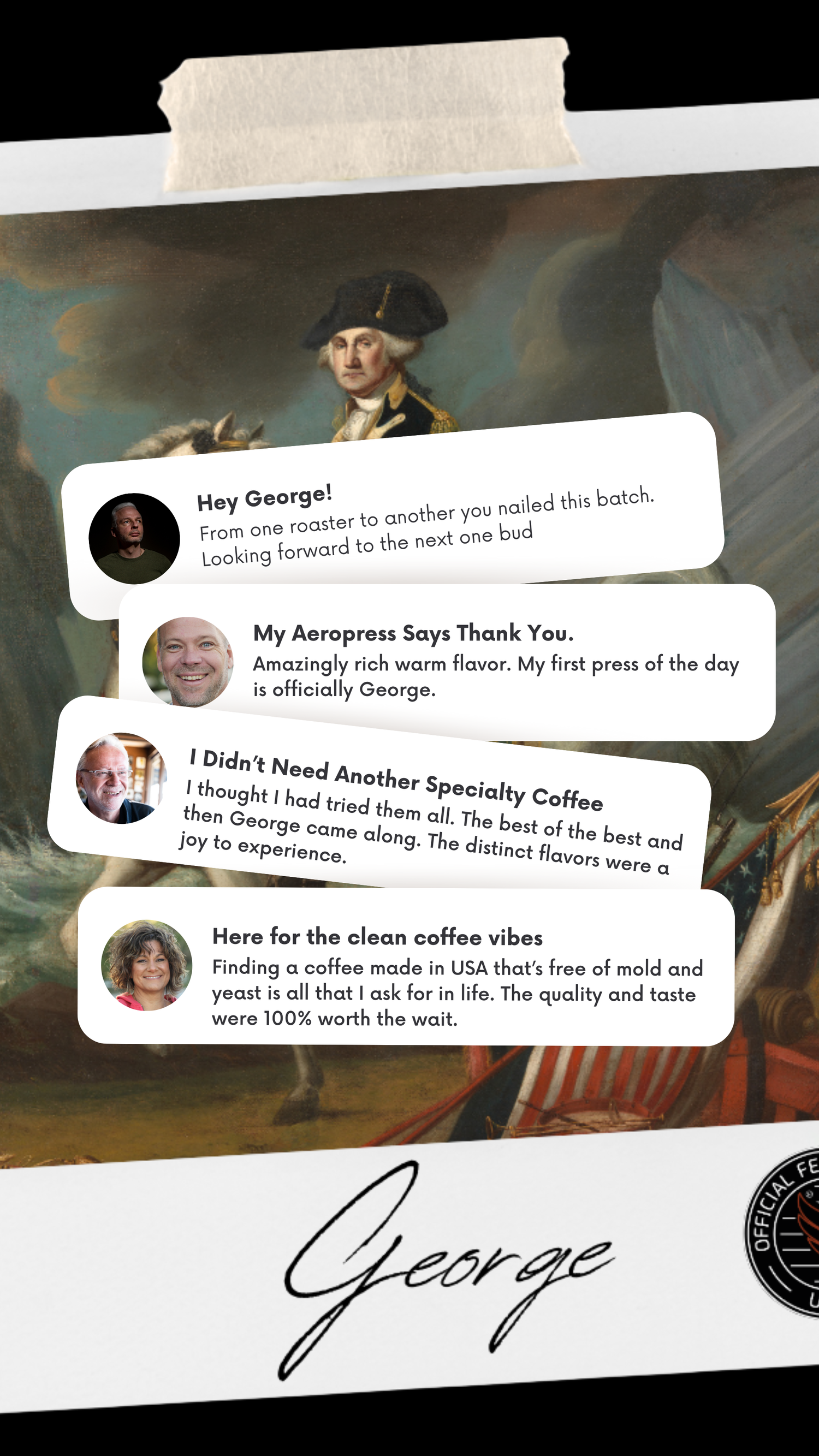 American coffee lovers have discovered GEORGE—and they're not going back to ordinary coffee. From the smooth, complex flavor profile to the pride of supporting American craftsmanship, Fellow Citizens consistently praise GEORGE's uncompromising quality. Every batch is Specialty Grade certified, lab-tested for purity, and roasted fresh to order. Limited to 2026.